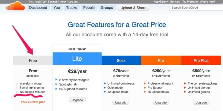 Den embed-Code findet man nach der Registrierung auf soundcloud.com. Zu den denkbaren Kosten hier ein Screenshot: