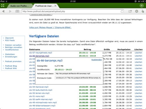 - MP3-Datei bei Podhost hochladen. Nach dem Registrieren bekommt man dort z.B. monatlich 30 MB Speicherplatz.