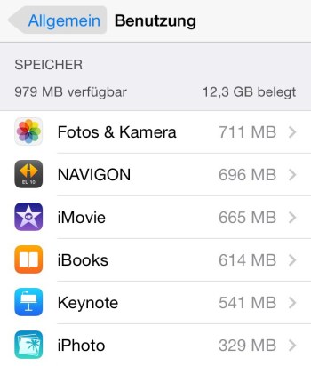 Zunächst einmal rate ich zu einem Blick unter >Einstellungen >Allgemein >Benutzung. Dort wird zunächst das kleine Symbol „Laden“ kreisen, dann wird aber ganz eindeutig angezeigt, welche Anwendungen hier den Speicherplatz belegen. Bei mir waren nur 976 MB verfügbar, aber 12,3 GB belegt. Erste Erkenntnis: Es stehen nur rund 13 GB von den gekauften 16 GB für Apps und deren Daten zur Verfügung, den Rest benötigt iOS!