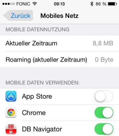Interessant ist auch, dass man auf dem iPhone unter „Mobile Daten verwenden“ einstellen kann, für welche App die mobile Datennutzung zugelassen werden soll. Dort wird im laufenden Zeitraum auch der aktuelle Verbrauch der jeweiligen App angezeigt. Übrigens: Wer automatisch Fotos in die Cloud lädt oder die Apps automatisch aktualisieren lässt, sollte hier die betroffenen Apps ausschalten!