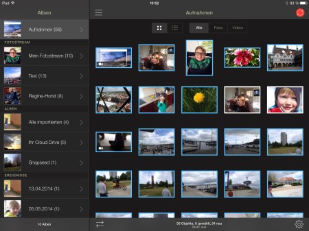 Im App Store kann man sich die z.Z. aktuelle Version 2.2 der App PhotoSync für 2,99 € laden und installieren. Nach dem Start bekommt man dann eine Übersicht aller auf iPhone bzw. iPad vorhandenen Bilder/Videos. Je nach Einstellung (zwei Pfeile unten links) kann man diese sehr schön anzeigen oder auswählen.
