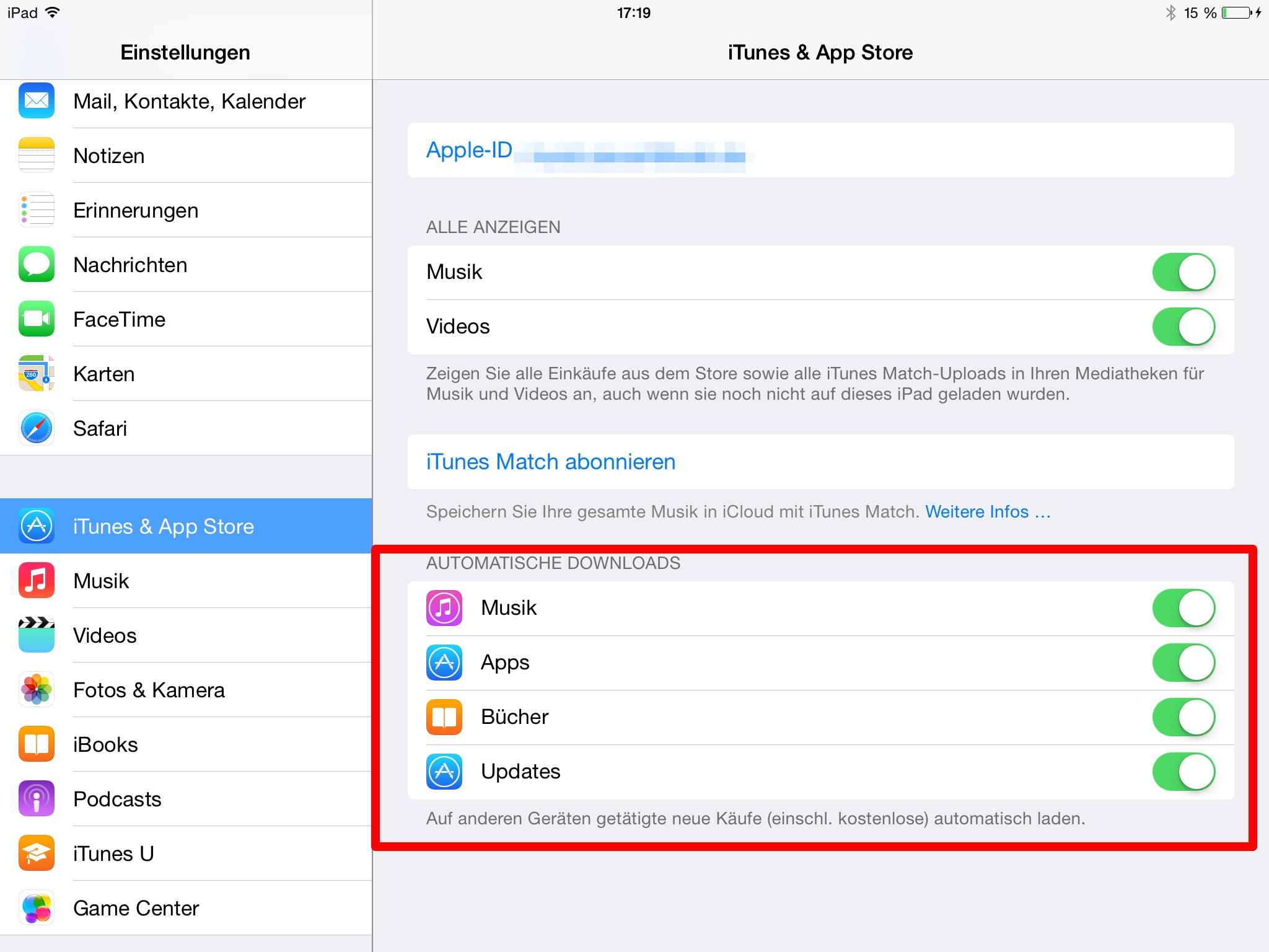 Auf meinem Geräten habe ich über >Einstellungen >iTunes & App Store, wie auf dem obigen Screenshot sichtbar, vier Schiebeschalter eingeschaltet. So habe ich alle bei Apple gekaufte Musik, alle App, alle Bücher und vor allen Dingen auch die regelmäßig erscheinenden Updates der Apps immer auf allen Geräten.