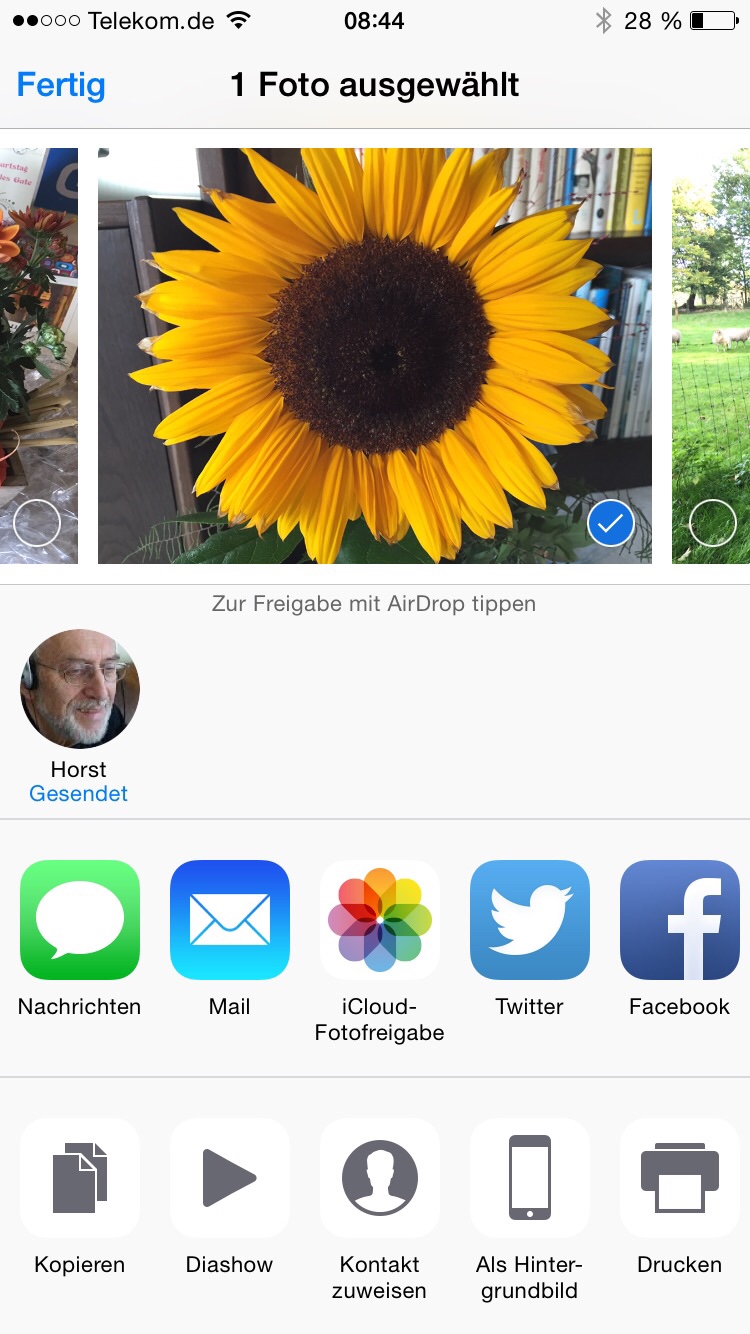 Zunächst einmal ruft man die zwischen zwei iOS-Geräten, z.B. iPhone und iPad, zu teilende Datei, z.B. mein Foto einer Sonnenblume, auf. Dann tippt man auf das Teilen-Symbol „Viereck mit Pfeil“ und erhält das Bild des obigen Screenshots. Dort sollte das Gerät des Empfängers zu sehen sein und man tippt einfach auf dessen Bild und die Datei wird unmittelbar übertragen.