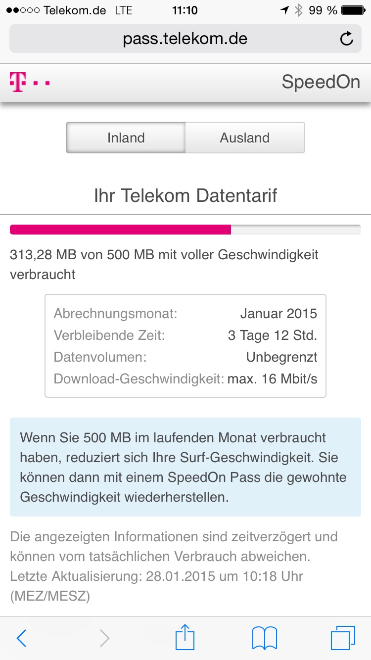 Mein Mobilfunkanbieter Telekom lässt mich zum Glück auch nicht ganz allein. Über den Browser, z.B. den als Standard eingestellten Safari, ruft man pass.telekom.de auf und wird über den aktuellen Tarif und den Verbrauch mit voller Geschwindigkeit informiert. Bedingung: Man muss die Seite über das Mobilfunknetz aufrufen, d.h. ggf. WLAN ausschalten. Hier das Beispiel: