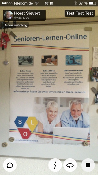 Der Produzent einres derartigen Live-Videos sollte sich auf seinem iPhone die App Meerkat installieren – z.Z. gibt es wohl noch keine Lösung für andere Smartphones. Dann benötigt er einen Twitter-Account, mit dem er sich in der App anmeldet, denn alle Sendungen werden in Twitter öffentlich mit einem Link angekündigt. Das Streamen beginnt ganz einfach durch ein Tippen auf >Stream. Man sieht das mit den Kameras des iPhones aufgenommene Video. Die Kamera muss hochkant gehalten werden, denn Queraufnahmen sind nicht möglich. Und zum Start wird immer die „normale“ Kameraund nicht die Frontkamera angezeigt – wichtig für Menschen, die sich selbst nicht gerne ansehen mögen.
