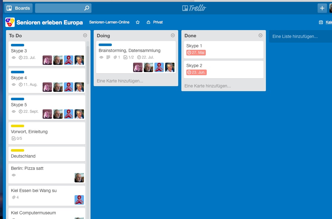 Das Angebot von Trello ist zum Managen von kleinen Projekt vorzüglich geeignet. Die prinzipielle Arbeitsweise habe ich für einen Workshop bei SLO bereits einmal beschrieben. Man arbeitet in einem Board (=Projekt) mit Cards (=Aufgaben), die man zunächst der Liste To Do zuordnet. Im laufenden Prozess verschiebt man die Cards dann in die Listen Doing bzw. Done.