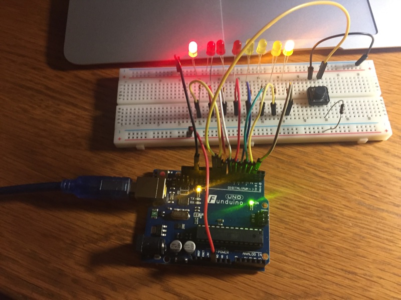 Bei der Gelegenheit habe ich dann auch für das oben fotografierte Lauflicht einen Arduino-Sketch erstellt. Mein Vorgehen für diese Dinge ist „Learning by Doing“, was hier durch wenige überschaubare Regeln und ein festes Prinzip unterstützt wird: 1) Variablen benennen, also z.B. den Namen der Pins für LED und Taster. 2) Setup festlegen, also im Beispiel den Modus des Tasters als INPUT und den der LED als OUTPUT, und 3) Im Loop festlegen, was kontinuierlich in dem Programm erledigt werden soll. Hier also die LED der Reihe nach von außen nach innen leuchten lassen und sobald der Taster gedrückt ist, von links nach rechts leuchten lassen.