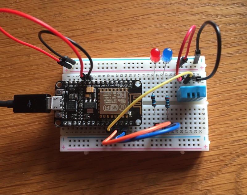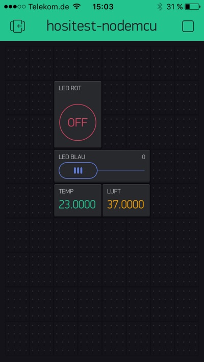 Meine Test mit dem Arduino Uno und dem Board NodeMcu waren insgesamt erfolgreich. Obiger Screenshot zeigt die von mir gestaltete App, mit der ich eine rote LED ein/aus-schalten, eine blaue LED dimmen und den Sensor DHT11 auslesen kann. Statt der LED kann man auch ein Relais anschalten und damit z.B. eine Zimmerlampe oder den Motor der Jalousie schalten. Die Bauteile werden zum Testen auf einer Steckplatine zusammengeschaltet. Der folgende Screenshot zeigt meine Lösung, die ich natürlich für einen endgültigen Einsatz professioneller in ein Gehäuse packen würde.