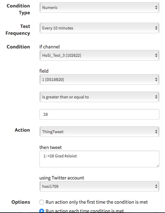 Bei der Auswertung hilft eine weitere App von ThingSpeak. Mit der App React kann man Details zum automatischen Senden eines Tweets festlegen. Wenn ich mir einen Kaffee koche, steigt die Temperatur an der Kaffeemaschine auf über 28 Grad und die Partner aus meinem privaten sozialen Netz können beruhigt über meine Aktivität sein.  Sie müssen nur meine Tweets verfolgen. Versieht man diese Tweets mit einem Hashtag, können sie leicht aus der Timeline heraus gefiltert werden.