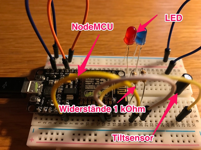 Für den 13. Tag wird diese Alarmanlage mit Push-Nachrichten vorgeschlagen. Wie das folgende Foto der Alarmanlage zeigt, habe Ich die dort gezeigte Aufgabe etwas abgeändert. Ein Tiltsensor signalisiert jede Bewegung bzw. Erschütterung des Versuchsaufbaus. Er aktiviert einerseits eine rote LED zum Blinken, sendet aber gleichzeitig eine Push-Nachricht an das Smartphone, auf dem ein entsprechendes Projekt in der App Blynk abläuft.