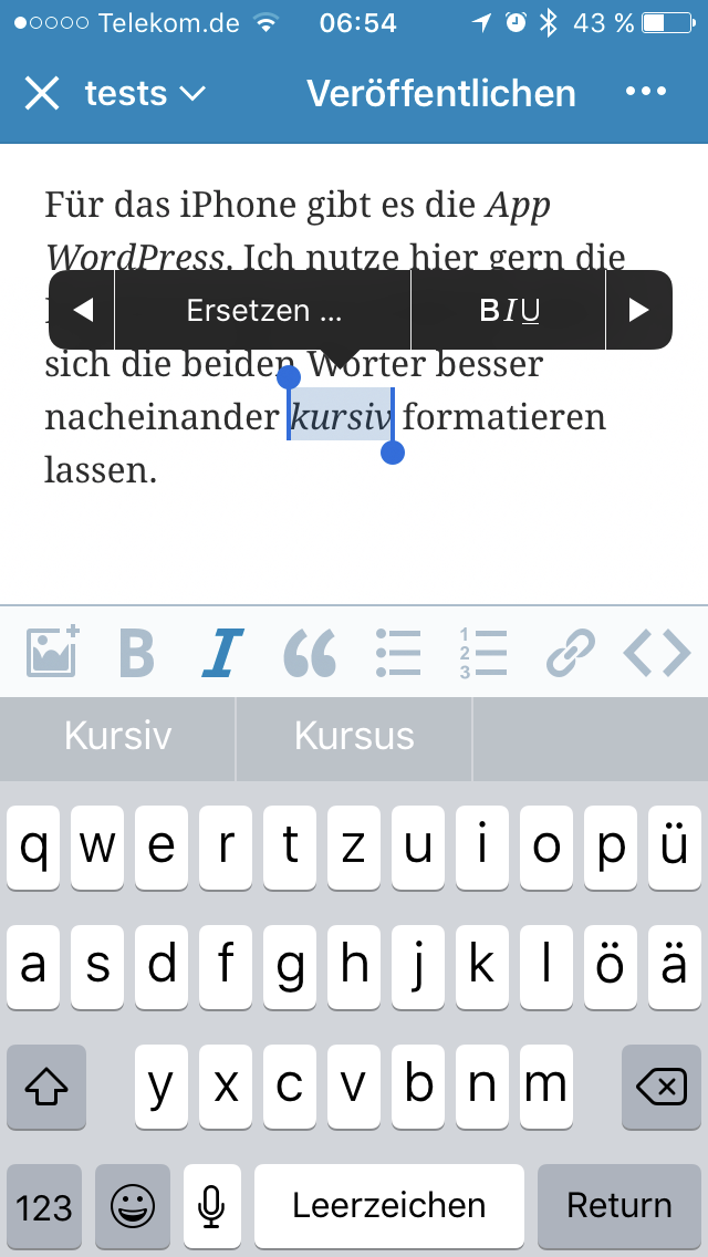 Für das iPhone gibt es die App WordPress. Ich nutze hier gern die Formatierung und stelle fest, dass sich die beiden Wörter besser nacheinander kursiv formatieren lassen.