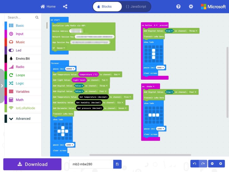Den Programmcode habe ich wieder auf dem iPad über die App micro:bit erstellt. Die App ermöglicht einen schnellen Zugriff auf den Editor https://makecode.microbit.org. Dort sollte man sich die Erweiterungen LoRa Node und Envirobit installieren, um dann einfach aus mehreren Blöcken seinen Programmcode zu basteln.