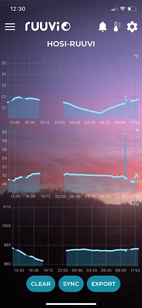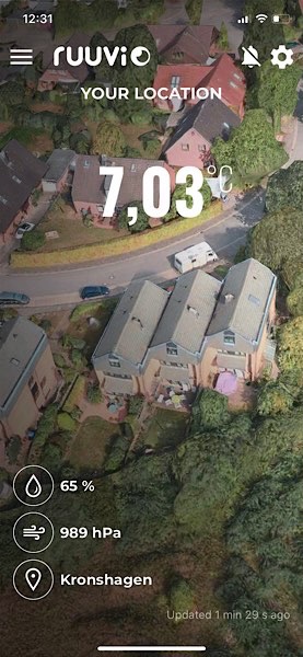 Dieses kleine Gerät hat einen Durchmesser von 5 cm und wiegt nur 25 g. Es stammt von ruuvi aus Finnland und nutzt u.a. den Bosch-Sensor BME280 zum Messen von Temperatur, Luftdruck und Luftfeuchtigkeit. Ich habe es über Bluetooth Low Energy (BLE) auf meinem iPhone mit der App Ruuvi Station verbunden.