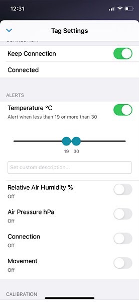 Im oben gezeigten Beispiel würde ich auf meinem iPhone alarmiert, wenn die Temperatur unter 19 Grad sinkt oder über 30 Grad ansteigt. Interessant ist auch die Möglichkeit zur Alarmierung, wenn man mit dem iPhone aus der Reichweite von BLE kommt (Connection einschalten). So lässt sich der RuuviTag schließlich auch zur Sicherung von Wertgegenständen, z.B. des eBykes vor dem Haus, einsetzen (Movement einschalten und auf gute Reichweite von BLE hoffen).