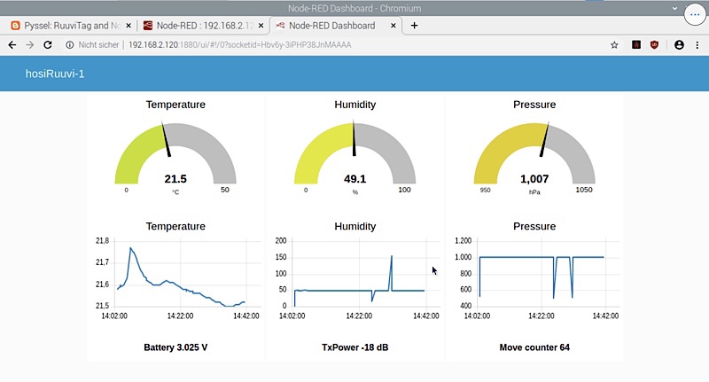 Zur Anzeige der Messwerte kann der RuuviTag über Bluetooth LE nicht nur mit dem Smartphone, sondern auch mit einem Computer, z.B. dem Raspberry Pi, verbunden werden. Dazu sollte dort Node-Red installiert sein, wie ich hier bereits einmal beschrieben habe.