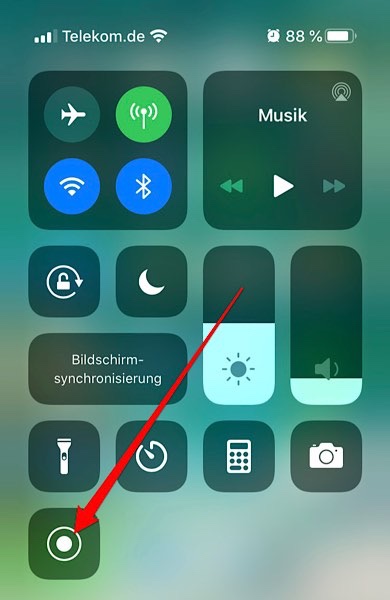 In einem ersten Schritt sollte geprüft werden, ob im Kontrollzentrum die Bildschirmaufnahme für das genutzte Gerät eingeschaltet ist. Dieses Kontrollzentrum erreicht man bei aktuellen Geräten durch Wischen von rechts oben nach unten (bei älteren Geräten m.W. durch Wischen von rechts unten nach oben).