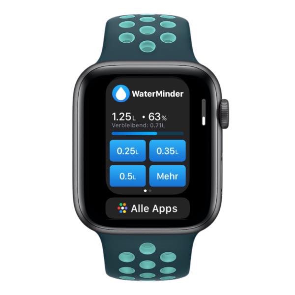 Die App WaterMinder ist ein typisches Beispiel für die Nutzung der Apple Watch. Die App wird auf dem iPhone installiert und ermittelt über persönliche Daten, wie Alter, Größe und Gewicht, den täglichen Trinkbedarf und überwacht diesen auch.