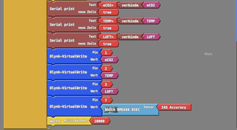 Die Doppelschleife wird einerseits genutzt, um die fest auf dem Octopus verbauten Neopixel in Abhängigkeit von eCO2 in grün, gelb oder rot zu schalten. Mit dieser Doppelschleife wird aber auch eine kleine Ampel über die virtuellen Pin 4, 5 und 6 bei Blynk geschaltet.