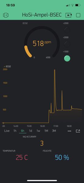 Zur Anzeige von IAQ accuracy eine Anmerkung: Dieser Wert zeigt die Aktivität des Software-Sensors BME680 BSEC. Nach etwa 5 min zeigt er auf 1, danach kalibriert er automatisch und zeigt 2 und nach dem Einpendeln den Wert 3.
