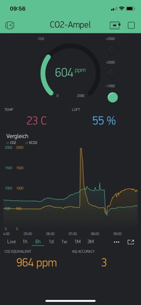 Ich habe eine weitere CO2-Ampel im Einsatz. Dort vergleiche ich seit einigen Tagen die Ergebnisse für CO2, die der externe Sensor SCD30 liefert mit dem eCO2 des internen Sensors BME680 BSEC.