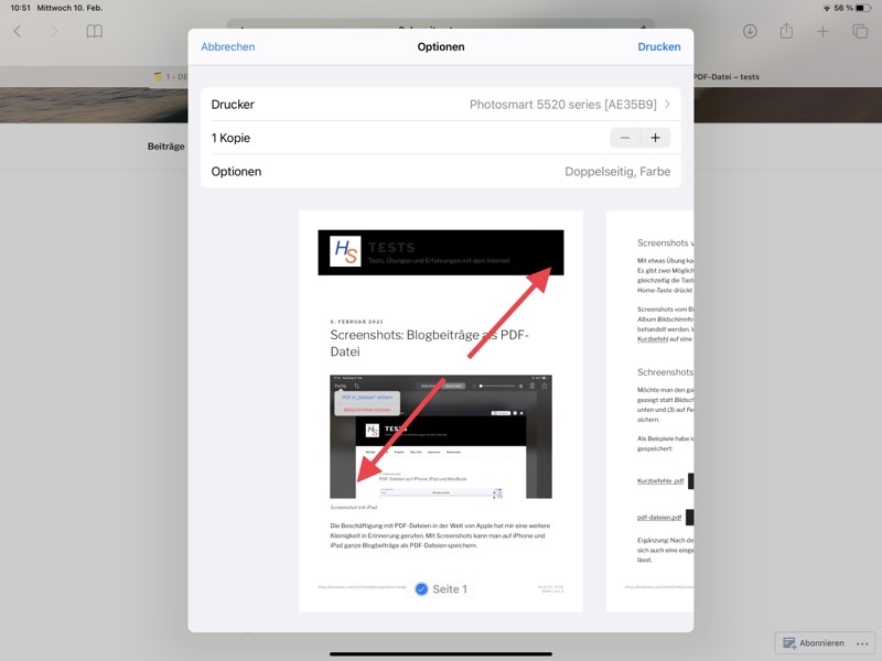Über das Teilen-Symbol starte man das Drucken und druckt dann aber nicht, sondern tippt mit 2 Fingern auf den Bildschirm und spreizt die Finger.