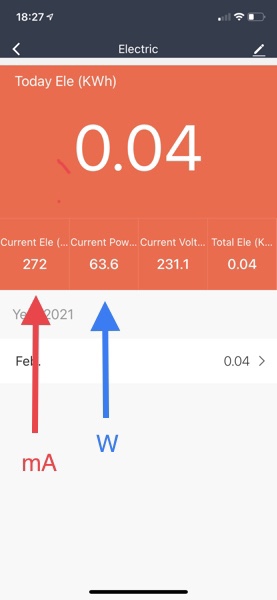 Weitere Details zu jeder Dose erreicht man, wenn man diese antippt. Dort kann man z.B. über >Timer und >Countdown auch ein automatisches Schalten organisieren. Für mich ist besonders der Punkt >Electric interessant, der eine schöne Übersicht über die Leistungsaufnahme der Verbraucher liefert.