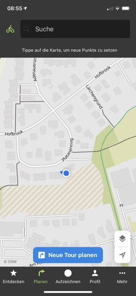 Die Planung einer neuen Tour erfolgt relativ einfach: Man entscheidet sich für die Art, legt Startpunkt und Ziel fest und bekommt schon einen Vorschlag auf einer Karte angezeigt. Weitere Punkte auf der Strecke lassen sich problemlos hinzufügen.