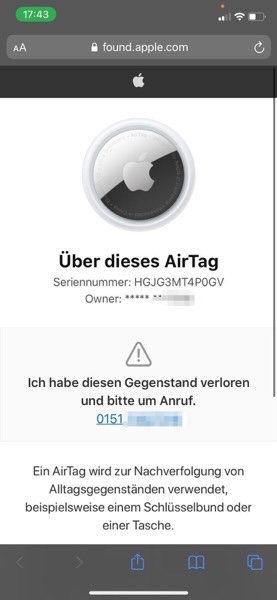 Der Finder eines AirTags ist zunächst ganz ahnungslos und erhält auch keine Informationen. Wenn er einen AirTag findet, den er keinem Eigentümer zuordnen kann, hat er aber die Möglichkeit mit Hilfe seines iPhones Informationen aus dem AirTag auszulesen. Das muss er aber wissen!