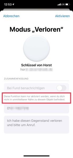 Sinnvoll ist, dass man Bei Fund benachrichtigen anhakt. Die erste Reaktion auf die Verlustmeldung wird dann eine Nachricht auf iPhone/iPad/Apple Watch sein.