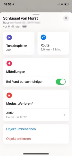 Wie bereits im vorherigen Beitrag beschrieben, meldet man diese kleinen AirTags auf iPhone/iPad in der App Wo ist? als Objekt an. Dort findet man dann den letzten Standort des Objektes auf einer Karte und kann für Details auf das Symbol tippen. Von dort kann der Eigentümer das Objekt auch als verloren melden.