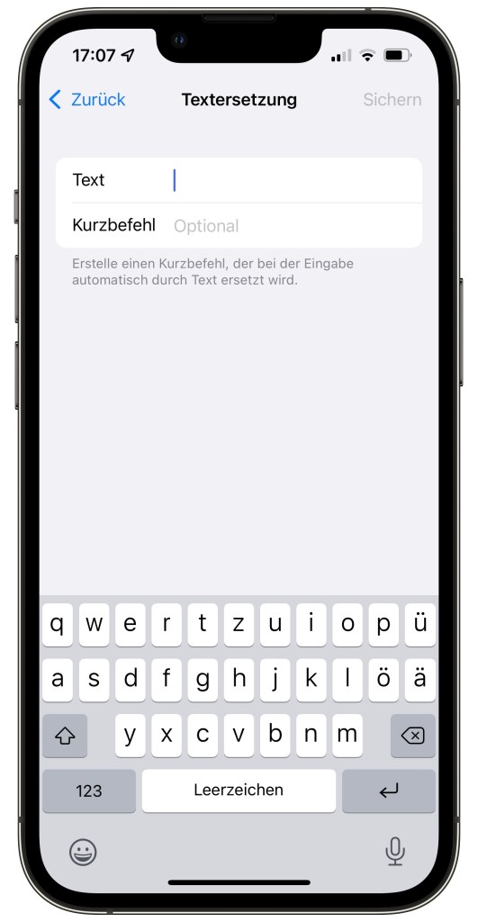 Jetzt muss nur noch der Text, z.B. Viele Grüße, eingetragen werden, den man durch den Kurzbefehl, z.B. vg, ersetzen möchte. Auf meinem iPhone sieht das dann wie folgt aus: