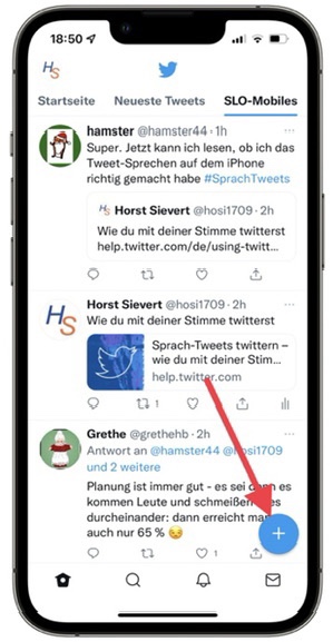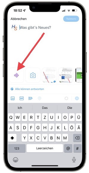 Drückt man etwas länger auf dieses Symbol, so kommt man u.a. auf das Symbol für Twitter Spaces. Ich erwähne das hier nur zum Verständnis.