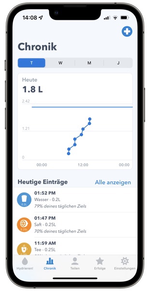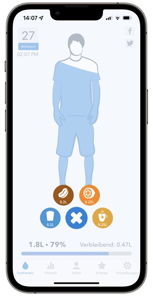 Meine von der App ermittelte Trinkmenge deckt sich mit dem ärztlichen Rat: 2 Liter sind ok. Gut finde ich, dass man neben Wasser auch andere Symbole einstellen kann. Dabei lässt sich auch der Effekt auf die Wasserzufuhr individuell einstellen. Ich bin bei der Voreinstellung geblieben, finde aber die Flexibilität interessant.