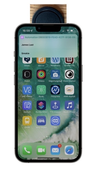 Auf modernen iPhones, d.h. XS oder neuer, öffnet man den Startbildschirm und hält das Gerät über den NFC-Tag oder -Sticker. Je nach dem dort hinterlegten Programm wird auf dem iPhone eine Aktion ausgelöst. Das Beispiel im folgenden Screenshot startet die App Musik.
