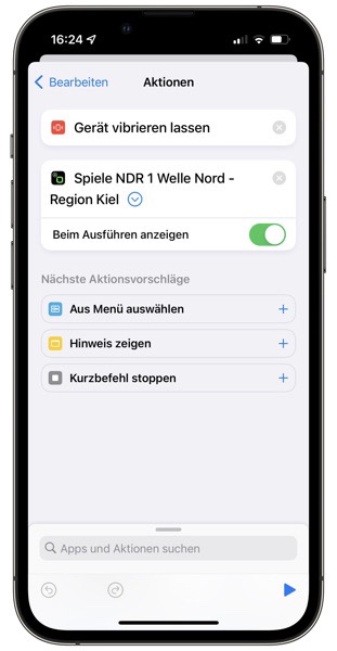 Bei der Aktion „Spiele Sender“ habe ich „beim Ausführen anzeigen“ gewählt. Komischerweise wurde ich dann beim 1. Start nochmal zum Bestätigen aufgefordert. Danach genügt aber nur ein kurzes Tippen mit dem iPhone auf den NFC-Tag und der Sender wird abgespielt.