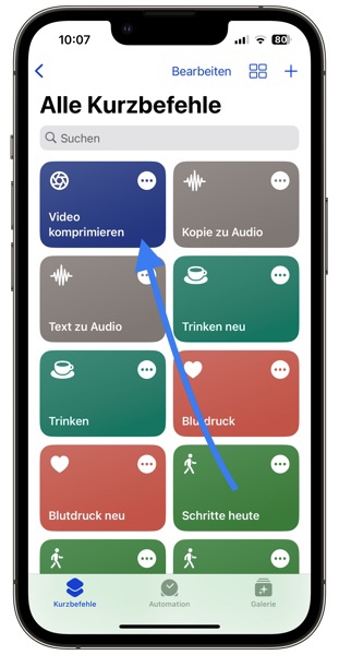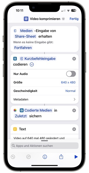 Das iPhone verleitet uns durch seine vielen Möglichkeiten leicht mit Bildern, Videos und Audios zu spielen. Wenn wir unsere Ergebnisse dann mit anderen teilen wollen, lernen wir besonders bei Videos schon einmal die Grenzen unserer Speicher oder die Grenzen der Sozial-Media-Apps kennen. Zum Teilen muss das Video also verkleinert, d.h. komprimiert, werden. Ich nutze dazu einen Kurzbefehl.