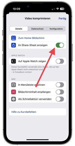 Beim Einrichten eines neuen Kurzbefehls, sollte also gleich ein Haken bei Im Share-Sheet anzeigen gemacht werden. Damit ist dann auch bereits die erste Aktion im Modus Bearbeiten eingefügt worden.