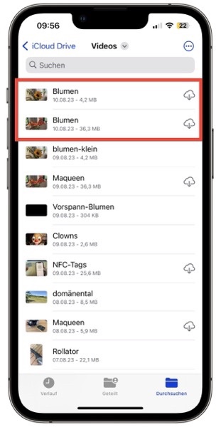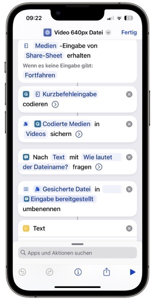 Dazu nutze ich einen Kurzbefehl, den ich direkt aus der App Fotos über Share-Sheet (teilen über Viereck mit Pfeil) ansteuere. Er codiert das Video und speichert die Datei in dem gewählten Ordner.