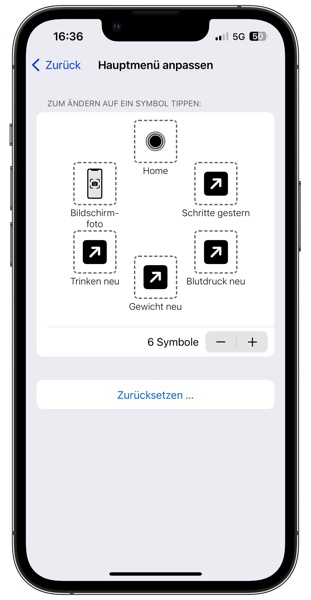 Im Hauptmenü können bis zu 8 Funktionen festgelegt werden, die man aus einer Vielzahl von Angeboten auswählen kann. So lässt sich das schwierige gleichzeitige Tippen von 2 Tasten für ein Bildschirmfoto ebenso vereinfachen, wie das Doppeltippen für die Nutzung von AppelPay.