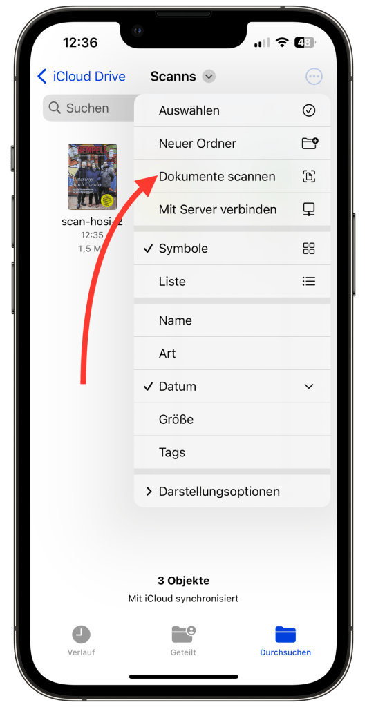 Das Scannen mit dem iPhone lässt sich unterschiedlich starten. Es gibt spezielle meist kostenpflichtige App oder man öffnet die App Notizen und scannt eine Vorlage als Notiz. Ich nutze den Weg über den Ordner „Scanns“, den ich in iCloud angelegt habe.