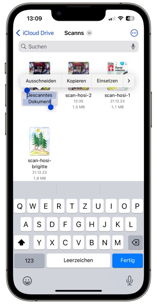 Wenn man den Ordner „Scanns“ geöffnet hat, kann man über die drei Punkte oben rechts auch das Scannen weiterer Dokumente starten. Meine Scanns versehe ich mit dem Namen „scan-hosi-x“. Das x ist Platzhalter für eine laufende Zahl oder einen Begriff (siehe Fotos oben).