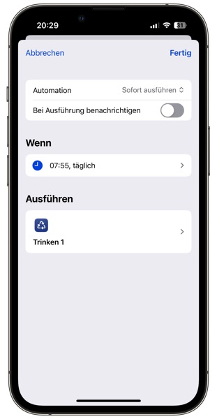 Ich habe eine persönliche Automation Tageszeit eingerichtet, die sofort auszuführen ist, wenn die Zeit 7:55 erreicht hat. Dann wird der Kurzbefehl Trinken 1 ausgeführt.