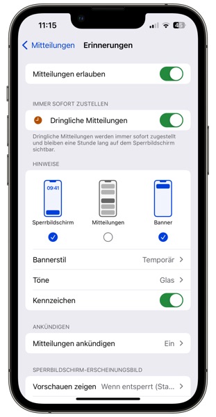 Für die App Erinnerungen habe ich auf dem iPhone über >Einstellungen >Mitteilungen die Mitteilungen aktiviert. Man kann sich dort auch einen individuellen Ton auswählen.