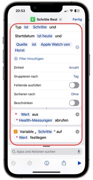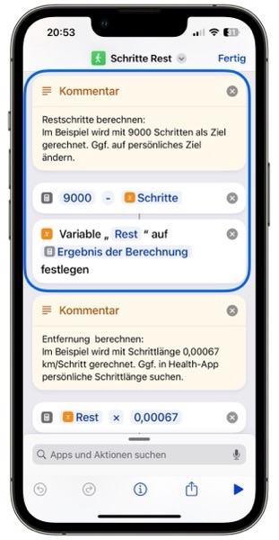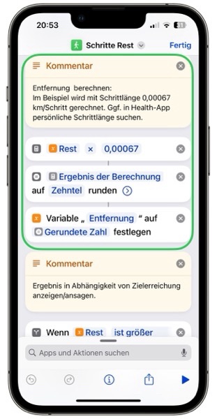 Als kleine Zugabe kann auch die Entfernung bis zum Ziel berechnet werden. Aus den Restschritten und der Schrittlänge wird die Entfernung berechnet. Die persönliche Schrittlänge kann aus der App Health entnommen werden.
