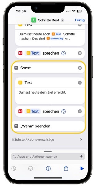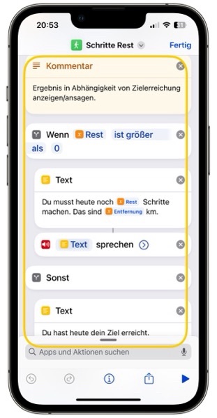 Für die Zielerreichung gibt es zwei Möglichkeiten. Entweder bleibt noch ein Rest (Rest ist größer 0) oder das Ziel ist erreicht bzw. überschritten (sonst). Die Anzeige wird daher über eine Wenn-Aktion realisiert.