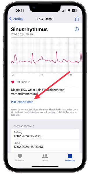 Bei Bedarf kann man das EKG-Ergebnis auch an den Arzt oder die Ärztin senden. Dazu auf PDF exportieren tippen und z.B. pef WhatsApp oder Mail senden.