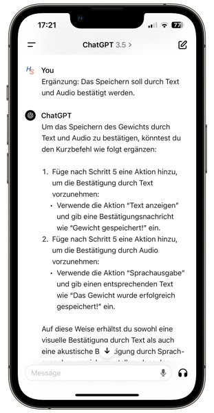 Das Fragen hat dann schon etwas gedauert. Mir ist aber doch diese Aufgabe gelungen: „Schreibe einen Kurzbefehl für das iPhone, um täglich das persönliche Gewicht in der App Health zu speichern.“