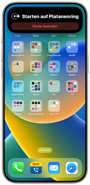Die beiden einleitenden Screenshots zeigen z.B. einen laufenden Timer. Neben dem Timer nutzt Apple diese Insel auch für die App Karten. Wenn diese zur Navigation benutzt wird, erscheint zur Unterstützung des gesprochenen Wortes ein blauer Pfeil zur Richtungsanzeige.