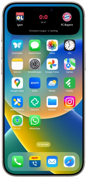 Auch externe Apps können die Dynamic Island nutzen. Die App Sportschau der ARD ist ein von mir relativ oft genutztes Beispiel. Oft sieht man sich Spiel A live an, möchte aber den Spielstand von Spiel B dazu verfolgen. Man kann sich daher spielbegleitend Spieldauer und Ergebnisstand anzeigen lassen.