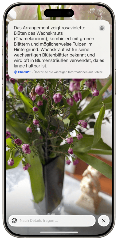 Über das Ergebnis der zweiten Frage bin ich schon überrascht. Seit langer Zeit fragt mich meine Frau immer wieder nach Blumennamen. Tulpen kenne ich schon, aber für alle anderen Blumennamen musste ich bisher ein Foto aufnehmen und speichern, um mir über das Info-i Namen aus dem Internet anzeigen zu lassen. Über Visual Intelligence klappt es jetzt viel schneller – und wohl auch informativer.